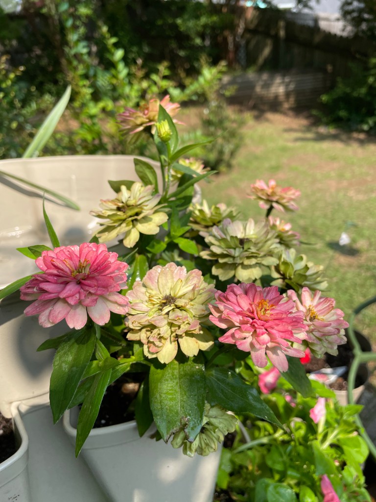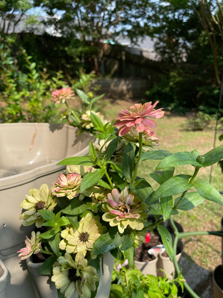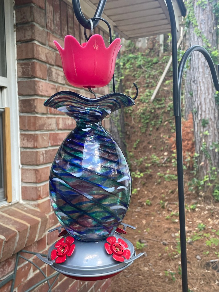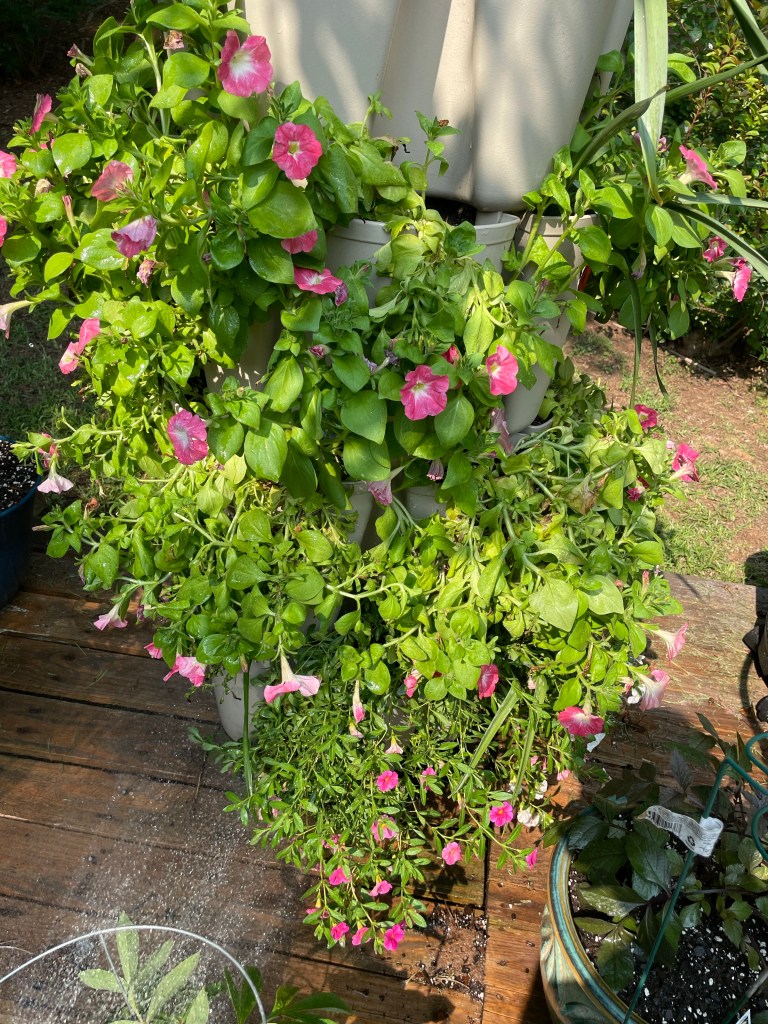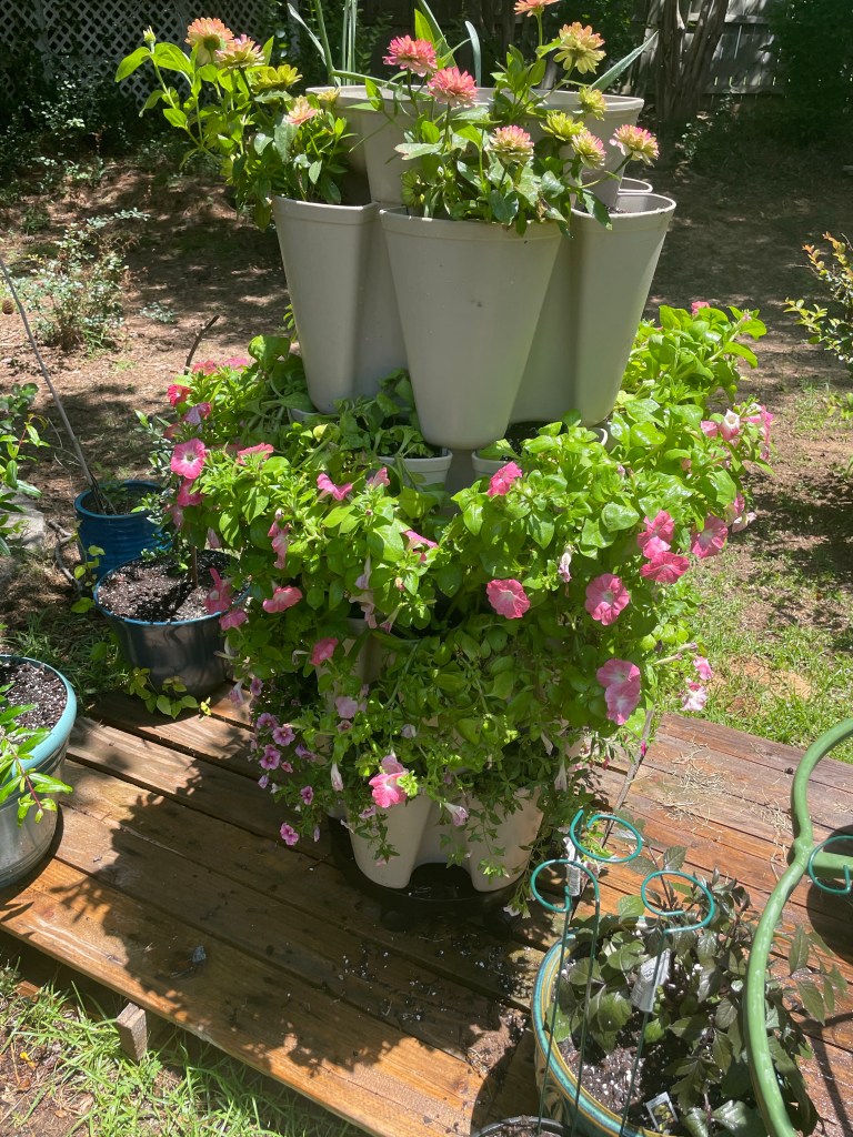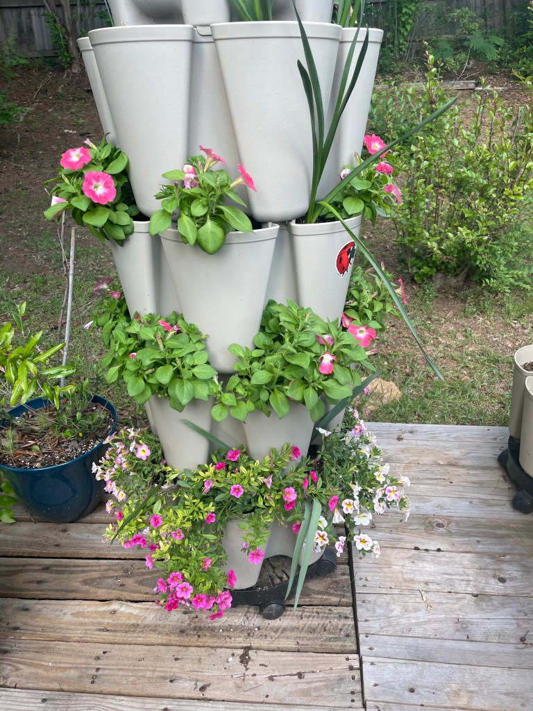 My flower tower is flourishing! I also got my hummingbird feeder up and hope to get my bird feeder back out tomorrow after a cleaning.