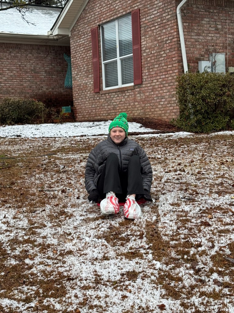 Alabama had a snow day. Em was spending the weekend with us. We snuggled in at home, played a board game and watched Migration and The Little Mermaid. We made a sourdough loaf, chocolate chip cookies, and sourdough pizza crust. Em played in the snow for a bit before it melted away.
