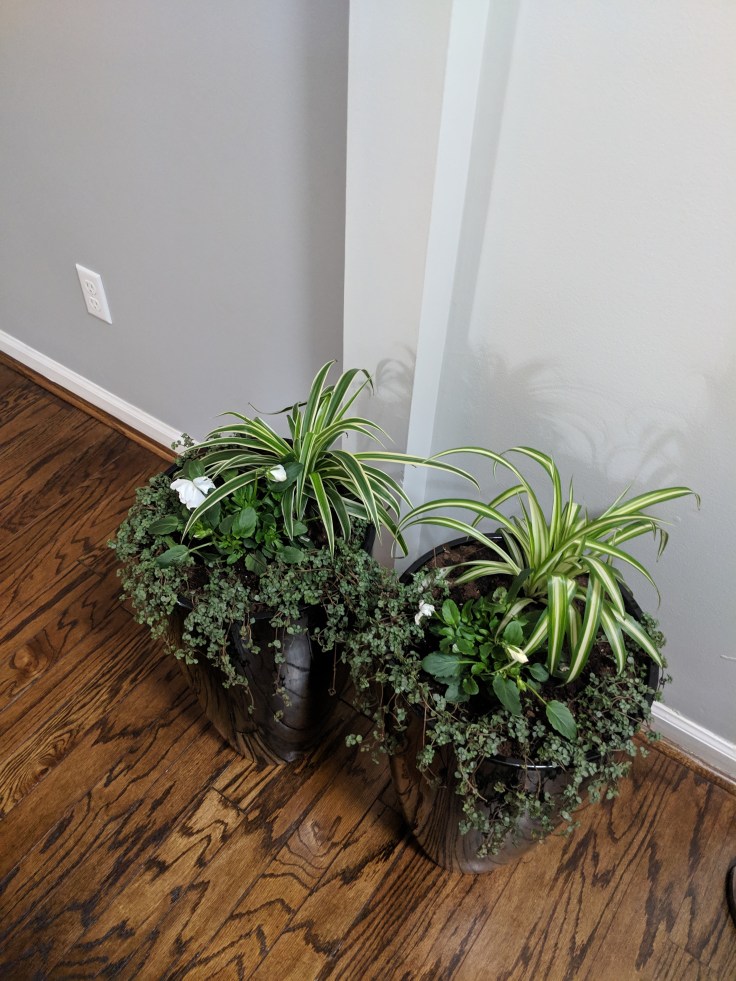 Planted some plant babies for the front porch. Here is a tip for tall pots. I put bottles, cans, balled up paper and bags into the bottom (on top of the layer of rocks), then I used a plastic drop cloth on top for a solidish layer before adding the dirt and flowers. It makes it lighter and more easily movable, especially with these cold nights.