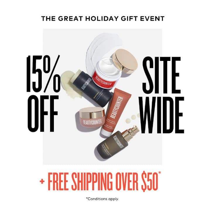 Beautycounter’s Black Friday event starts today! 15% off site wide (some exclusions apply) and free shipping over $50! Grab those gifts now. So many great ideas. Lip jellies, safer sun screen, eye shadow pallette. Don’t forget everything has a 60 day return policy even if you have used the product.