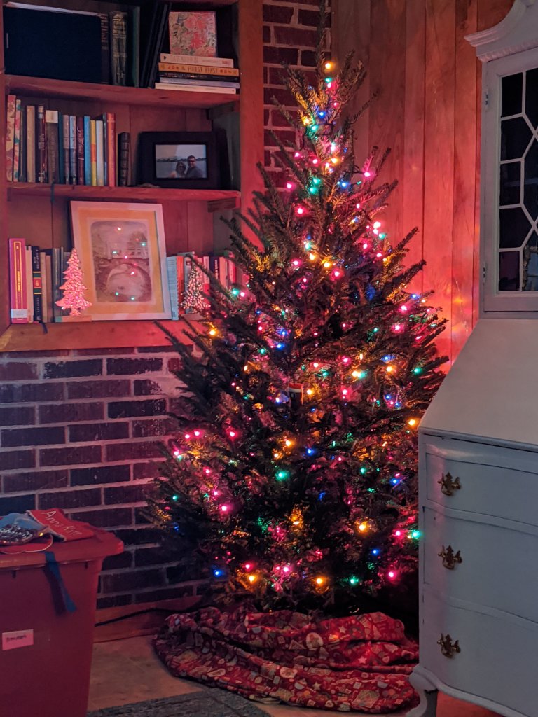 We collected our real Christmas tree on Tuesday night. Grown in the NC mountains of course. Fraser Fir, I keep waiting for the development of a Christmas tree farm to be woven into the Outlander series.